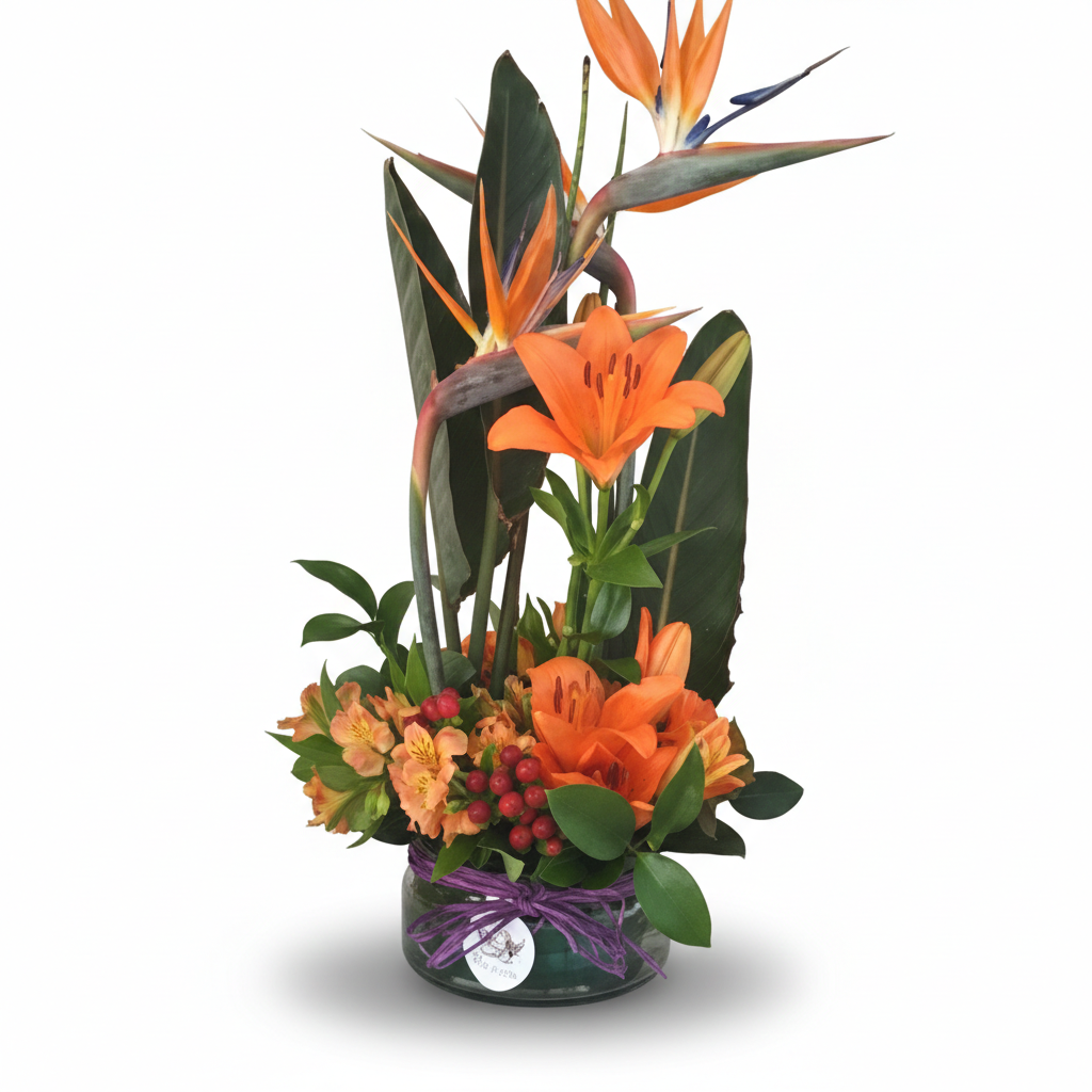 Dale un toque de sol y vitalidad a cualquier rincón con este impresionante arreglo de inspiración exótica. La pieza central destaca por la majestuosidad de las Aves del Paraíso (Strelitzia), que aportan una altura y estructura inigualables. Complementado con vibrantes liliums naranjas y delicadas astromelias en tonos cálidos, este diseño en base de cristal es una explosión de color. El follaje de hojas grandes y verdes profundos resalta la intensidad de los tonos naranja, creando un contraste natural y refrescante.