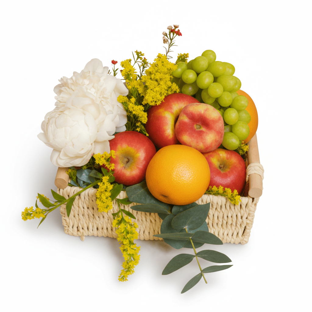 Celebra los momentos más dulces con una combinación exquisita de frescura y color. Este arreglo artesanal en cesta de mimbre une la delicadeza de las peonías blancas y el vibrante aroma del solidago con una selección premium de frutas de temporada: manzanas crujientes, uvas verdes frescas y cítricos radiantes. Es el detalle perfecto para iluminar un hogar, agradecer un gesto o desear una pronta recuperación con un toque de naturaleza y vitalidad.